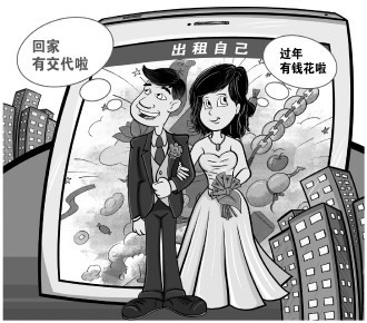 “租男友/女友回家,帮你摆脱催婚烦恼”“可拍婚纱照、可办形式婚礼,可见家长朋友”“出租自己当伴娘,费用300元,提前一天彩排加100元”……临近年关,在一些网络平台上,“出租自己”的业务更加火热,称可以提供陪聊、陪玩、扮演角色等服务,并在详情页内列出价格、自身优势等信息。