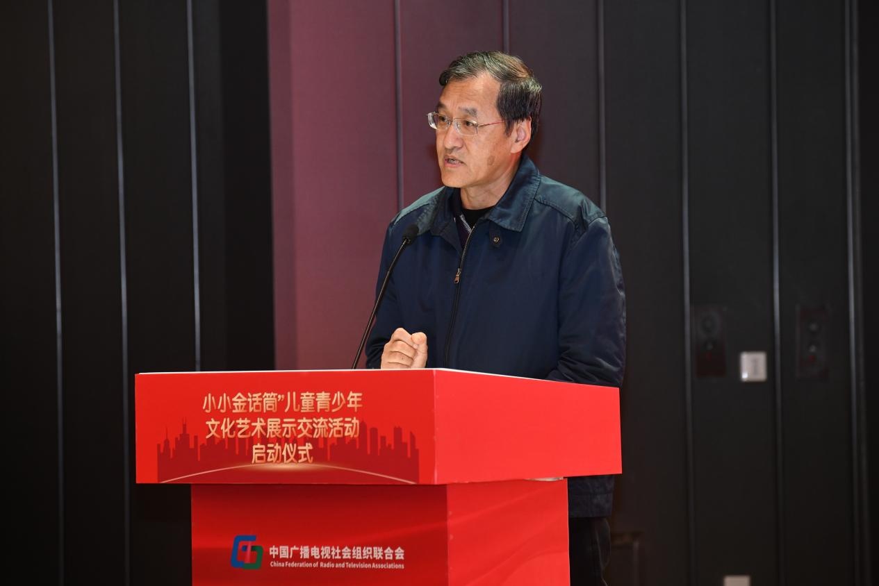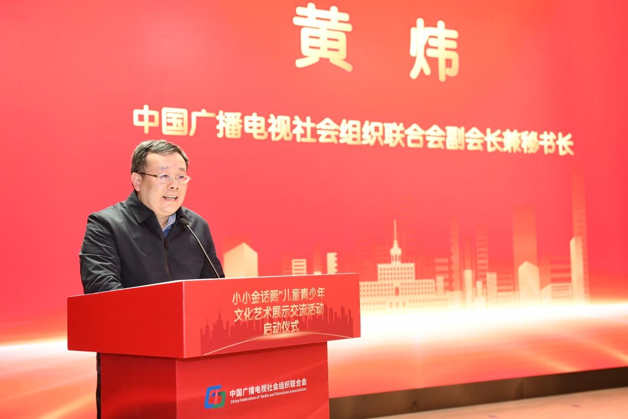 中国广播电视社会组织联合会副会长兼秘书长黄炜在“小小金话筒”儿童青少年展示交流活动启动仪式上讲话