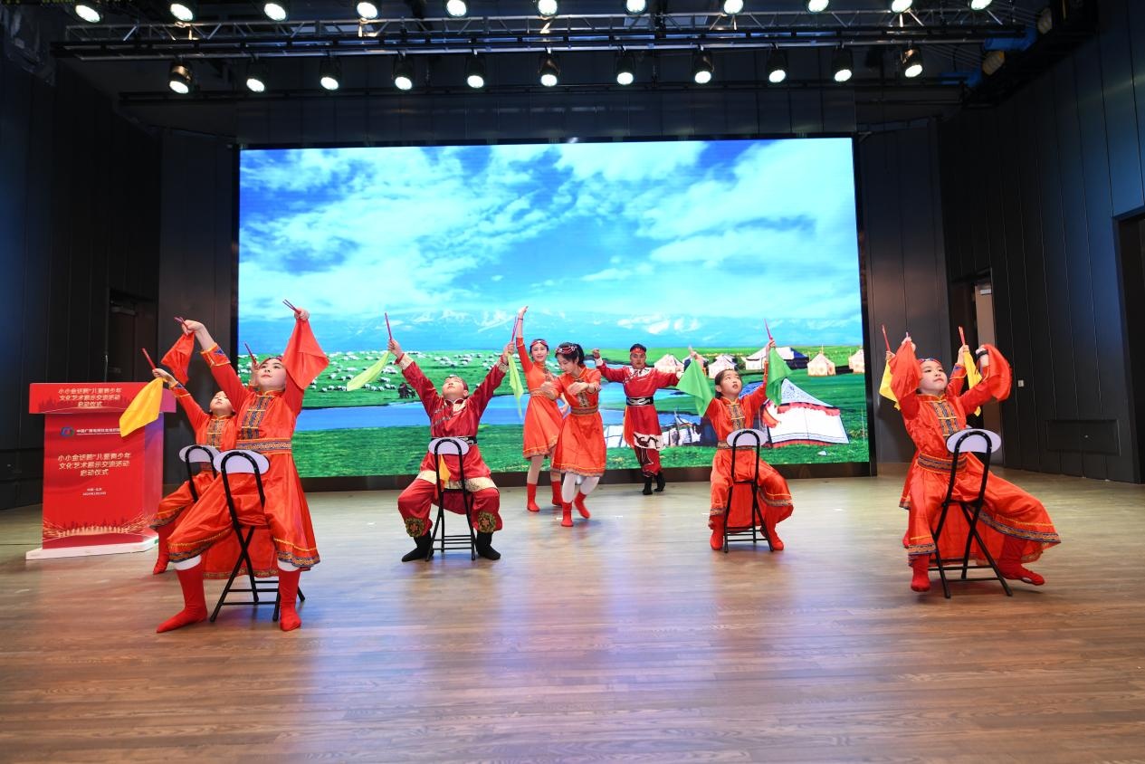 中广联合会少年儿童演艺委员会儿童代表在“小小金话筒”儿童青少年展示交流活动启动仪式上表演节目