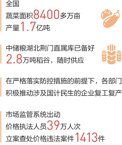 连日来,各部门积极组织蔬菜等副食品生产,确保蔬菜、肉蛋奶、粮食等居民生活必需品供应,加强统筹协调,保障煤电油气供应。同时,依法严厉打击利用疫情哄抬物价、囤积居奇、趁火打劫等扰乱社会秩序的违法犯罪行为。目前,全国生活必需品市场供应总体充足、价格稳定。全国路网保障和运行良好,物资运输整体有序。