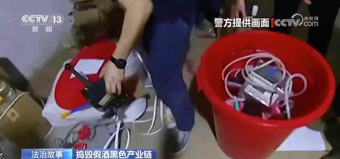 西安市公安局物流寄递犯罪侦查支队四大队民警 唐鹏鹏:他们把原料酒倒在一个桶里面,用罐装机抽出来,灌到每一个瓶子里面,然后再贴标签,封口、包装。所以他们最主要的技术就是包装,灌装酒,包括封盖、贴标,他们都有机器。