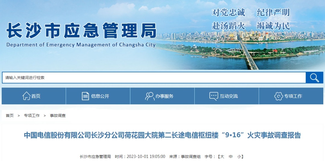 近日,湖南省长沙市应急管理局公布了《中国电信股份有限公司长沙分公司荷花园大院第二长途电信枢纽楼“9·16”火灾事故调查报告》。