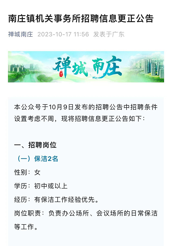 近日,广东佛山市南庄镇机关事务所“招聘保洁要求35岁以下”一事引发网络热议,网友纷纷质疑这条规定的合理性。10月17日,该机构工作人员回应称,此前招聘公告中对招聘条件设置考虑不周,目前已更正相关信息。