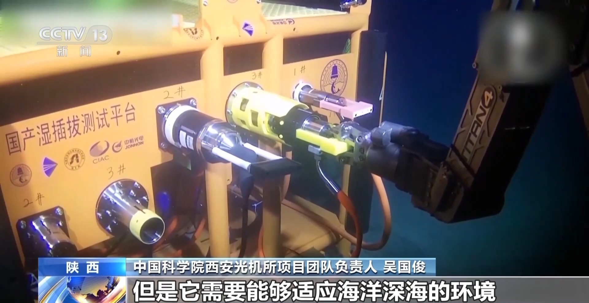 中国科学院西安光机所项目团队负责人 吴国俊:在深海海水大压力的环境下,能够实现电和光的连接的这样一个连接器,类似于插头插座,但是它需要能够适应海洋深海的环境,尤其在插的过程中,它其实是多个部件处于运动状态的一个动密封过程,所以我们这个连接器结构本身,它是一个非常精密而复杂的结构。