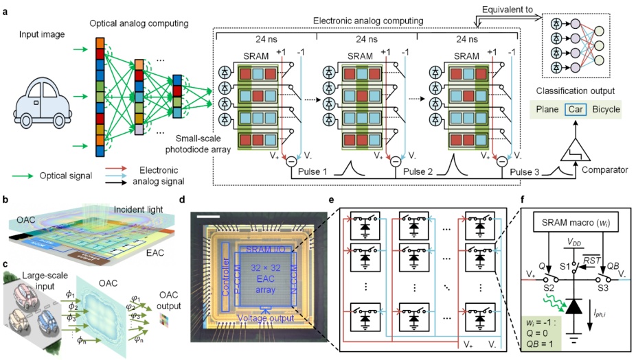 光电计算芯片ACCEL的计算原理和芯片架构。图片来源:《自然》杂志