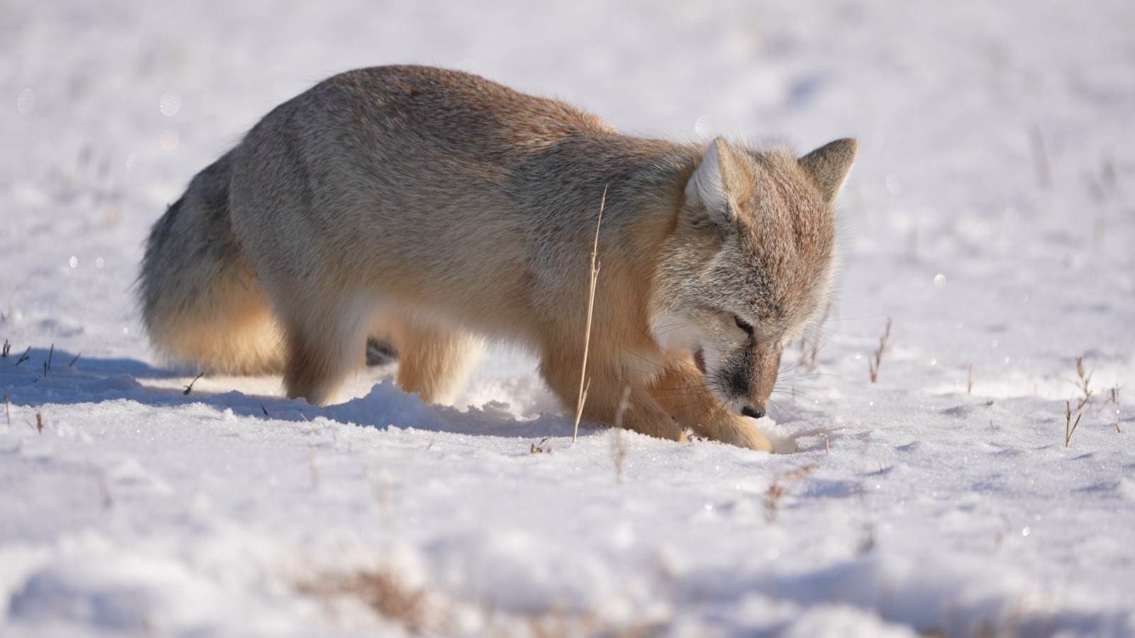 萌萌的小沙狐在白茫茫的雪原上搜寻着过冬所需的食物,时而坐下休息,时而警惕地竖起双耳听着雪底下的声音,小小的身躯,在雪地里一颠一跑憨态可掬。沙狐在找到食物后会用爪子挖坑,再用鼻子把食物埋在雪地里,为寒冬的到来做好准备。