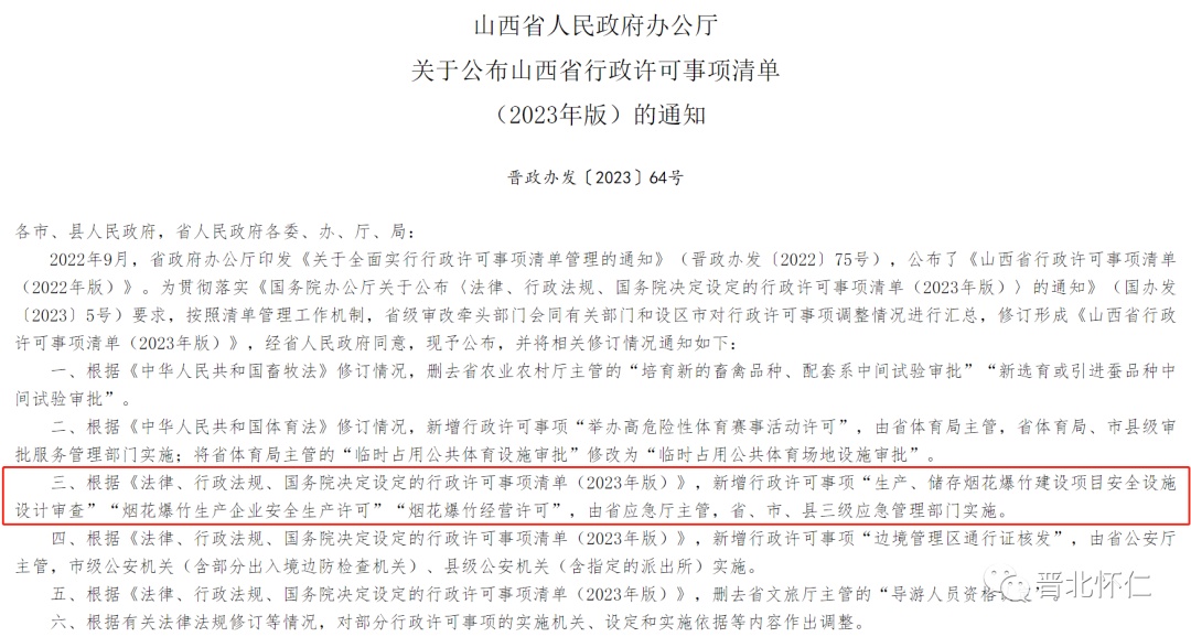 根据11月9日发布的《山西省人民政府办公厅关于公布山西省行政许可事项清单(2023年版)的通知》,山西省新增了一系列与烟花爆竹相关的行政许可事项,标志着对这一传统文化元素的管理政策逐步松绑,为新年带来了一抹烟花色彩。