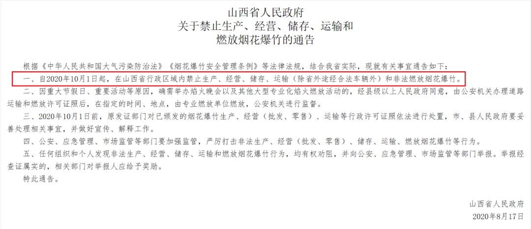 回顾2020年8月18日发布的《山西省人民政府关于禁止生产、经营、储存、运输和燃放烟花爆竹的通告》,在当时山西省实施了一项全域的“禁炮令”。