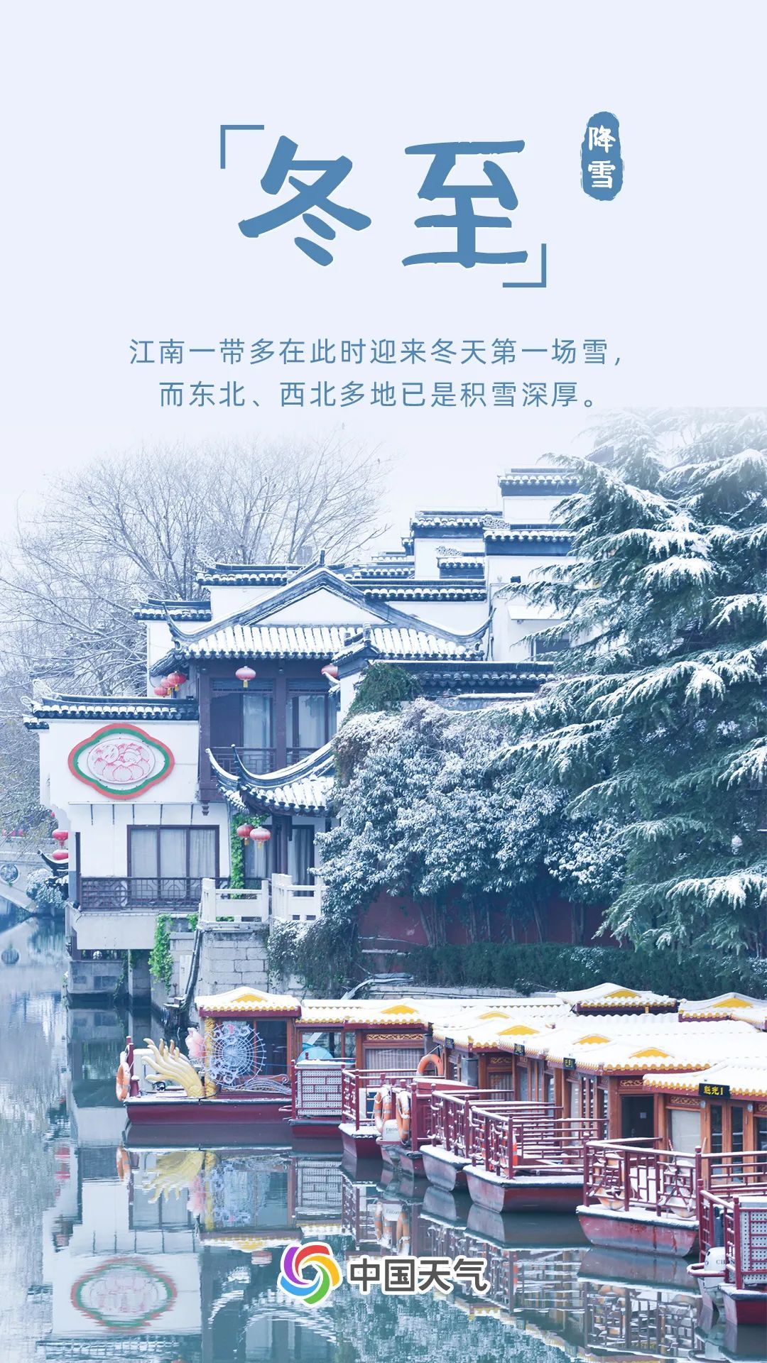 冬至期间我国雪线进一步南推,江南一带也开始由雨转雪,包括浙江、江西、湖南等地多地此时会迎来初雪。而东北、西北多地已是积雪深厚,还要警惕强风雪天气。