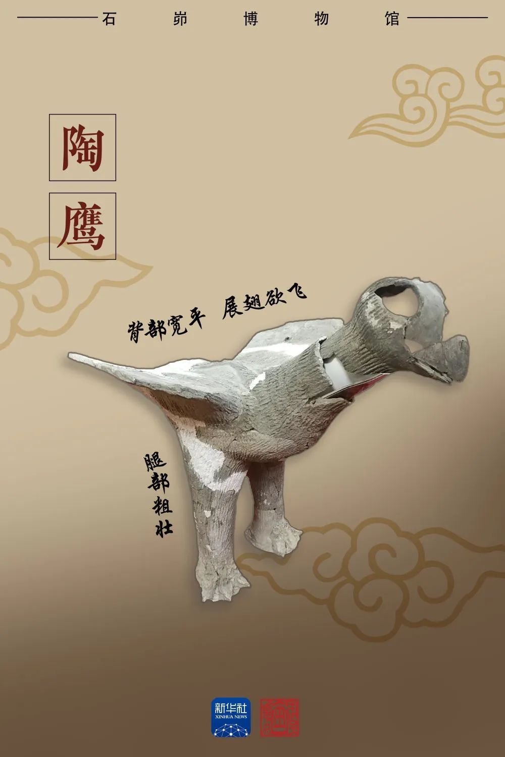 这一板块的镇馆之宝是一件大型的神面石雕,长度是2.5米、重1吨以上,出土于大台基南护墙的墙基部位,属于护墙的特殊装饰建材。结合皇城台出土的陶鹰,这件石雕可能也具有同样的表意功能,比如说对于鹰的图腾崇拜。