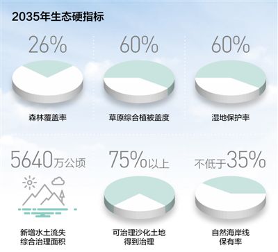 到2035年,生态系统质量明显改善,生态服务功能显著提高,生态稳定性明显增强,自然生态系统基本实现良性循环,国家生态安全屏障体系基本建成,优质生态产品供给能力基本满足人民群众需求,人与自然和谐共生的美丽画卷基本绘就。
