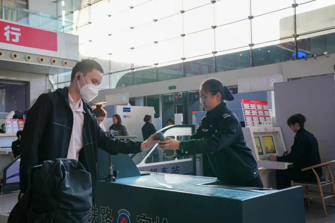 进站安检是保障旅客人身安全的重要措施。安检时,请依次排队过安检,不插队、不扰乱现场秩序,遵守携带物品相关规定,并主动配合安检人员检查。