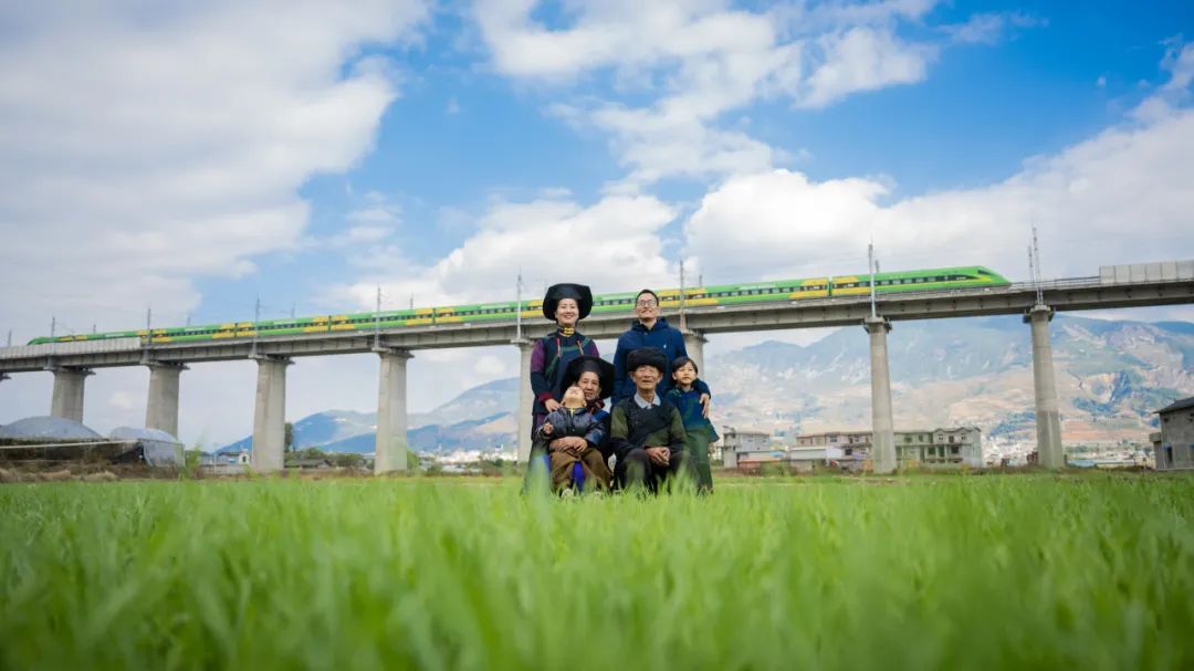 以前过年,全家福都是在屋里拍;今年的全家福,他们则前往家门口,将新成昆铁路、复兴号列车当成了背景。