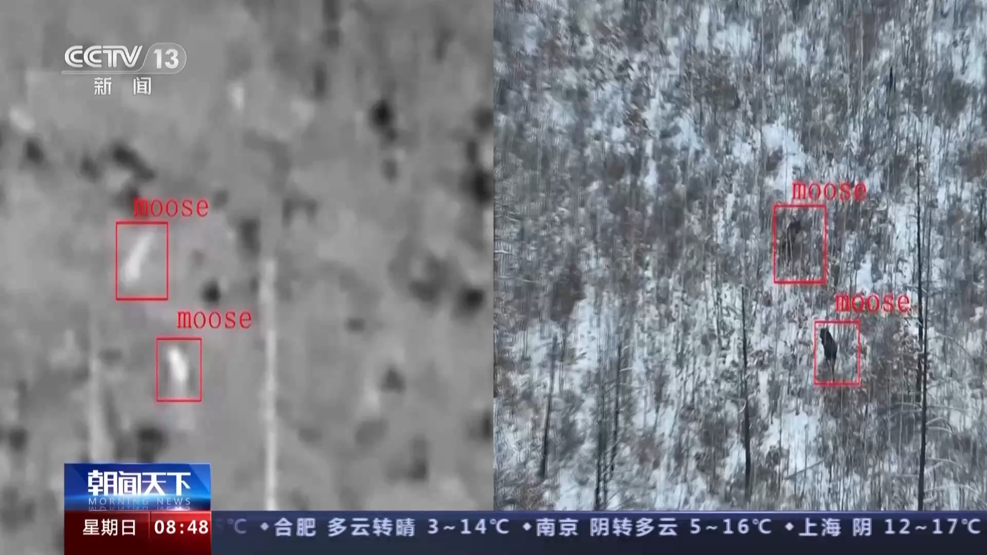 中国林科院副研究员 凌成星:驼鹿栖息的时候,就在那个雪窝里过夜休息,体温和雪窝从热成像的角度都会到我们无人机采集的数据里面。因为如果是从视频或者照片的角度,夜里根本不太可能直接发现有这么一个大型的野生动物藏在雪地里面。