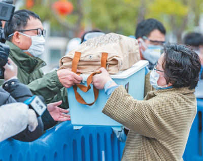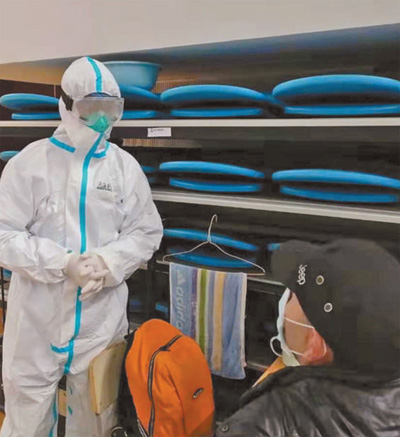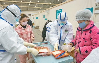 2月10日,在武汉客厅方舱医院,医护人员在分发餐食。