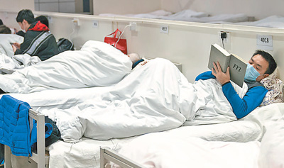 2月5日,在武汉江汉方舱医院,一名患者在床上看书。