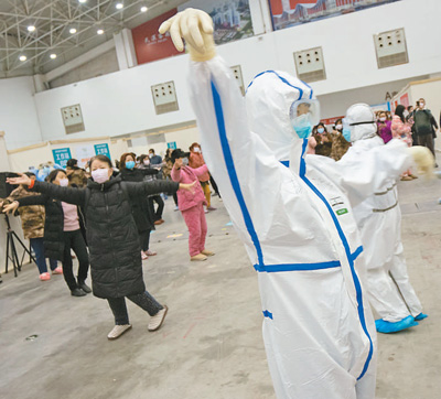 2月10日,武汉客厅方舱医院,患者在医护人员的带领下跳舞。