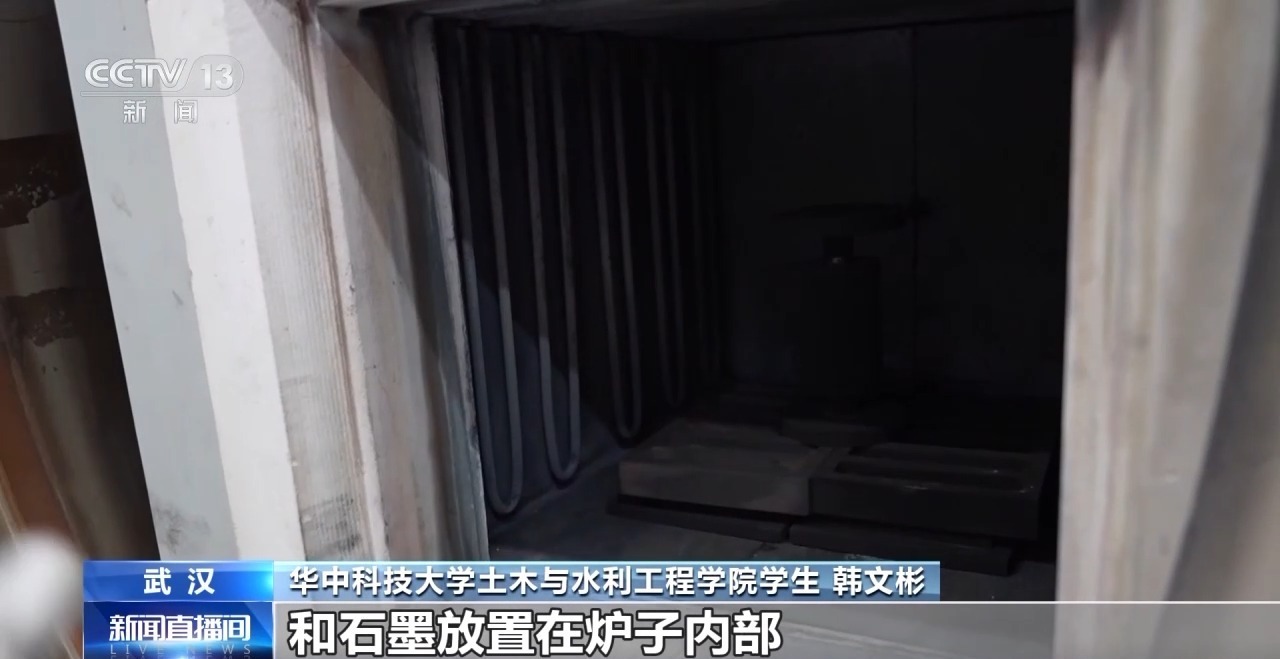 华中科技大学土木与水利工程学院 博士研究生 韩文彬:我们主要采用一种真空烧结的方式,对模拟月壤进行烧结成型。我们采用的石墨模具,内部有一个直径18毫米的空腔。我们首先将模拟月壤的粉末装填在内部,以石墨的压头对它进行压实,压实之后,再把它整个组装好;然后连同石墨模具,放到一个真空的烧结炉内部进行烧结。这个烧结炉的真空度可以达到10的负2次方帕,它主要是采用一种电加热,内部分布有10根加热棒,它是硅钼材料,通电之后就可以产生热量。我们将模拟月壤和石墨放置在炉子内部,热量就可以在抽真空之后,通过热辐射的方式对材料进行加热。
