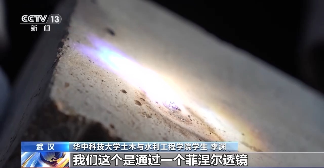 华中科技大学土木与水利工程学院学生 李渊:我们是通过一个菲涅尔透镜,把太阳光聚焦在一个点上,将来这个点上放的是月壤,通过聚焦点的高温把月壤烧结成砖。在月球上,一个白天的时间是比较长的,非常有利于在月球上进行太阳能烧结建造。