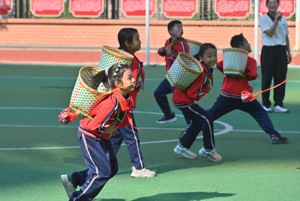 10月16日,在广西梧州市长洲区龙平小学,学生们在体育课上进行抛绣球比赛。新华社记者 黄孝邦 摄
