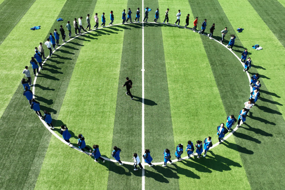 10月16日,兰州新区高级中学的学生在上体育课(无人机照片)。新华社记者 范培珅 摄