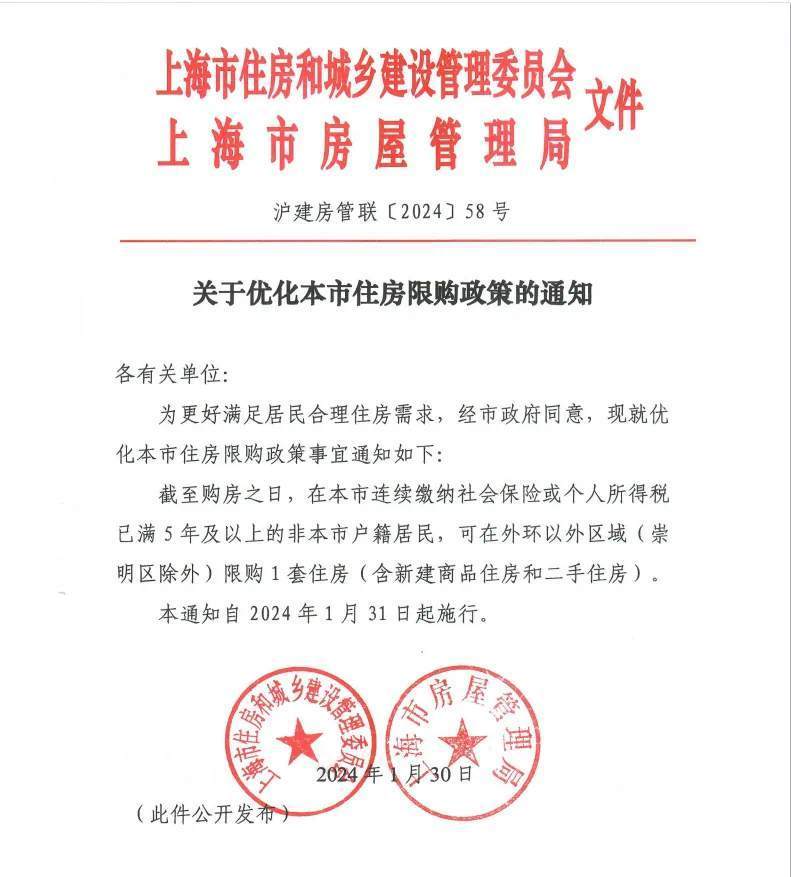1月30日,上海市住房城乡建设管理委、市房屋管理局联合印发《关于优化本市住房限购政策的通知》,规定自1月31日起,在上海连续缴纳社会保险或个人所得税已满5年及以上的非上海户籍居民,可在外环以外区域(崇明区除外)限购1套住房,以更好满足居民合理住房需求,促进区域职住平衡、产城融合。