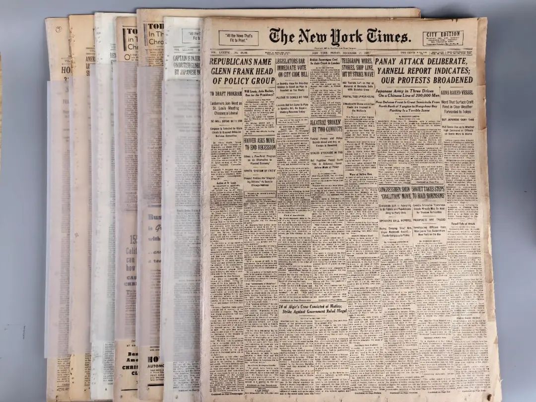 鲁照宁先生在美国四处搜寻的125份美国报纸,包括《纽约时报》《芝加哥每日论坛》《旧金山纪事报》《纽约世界电讯》《圣路易斯邮报》等14种,这些报纸报道了日本全面侵华战争初期日军对上海和南京等地进攻、日军暴行,以及中国抗战等内容。