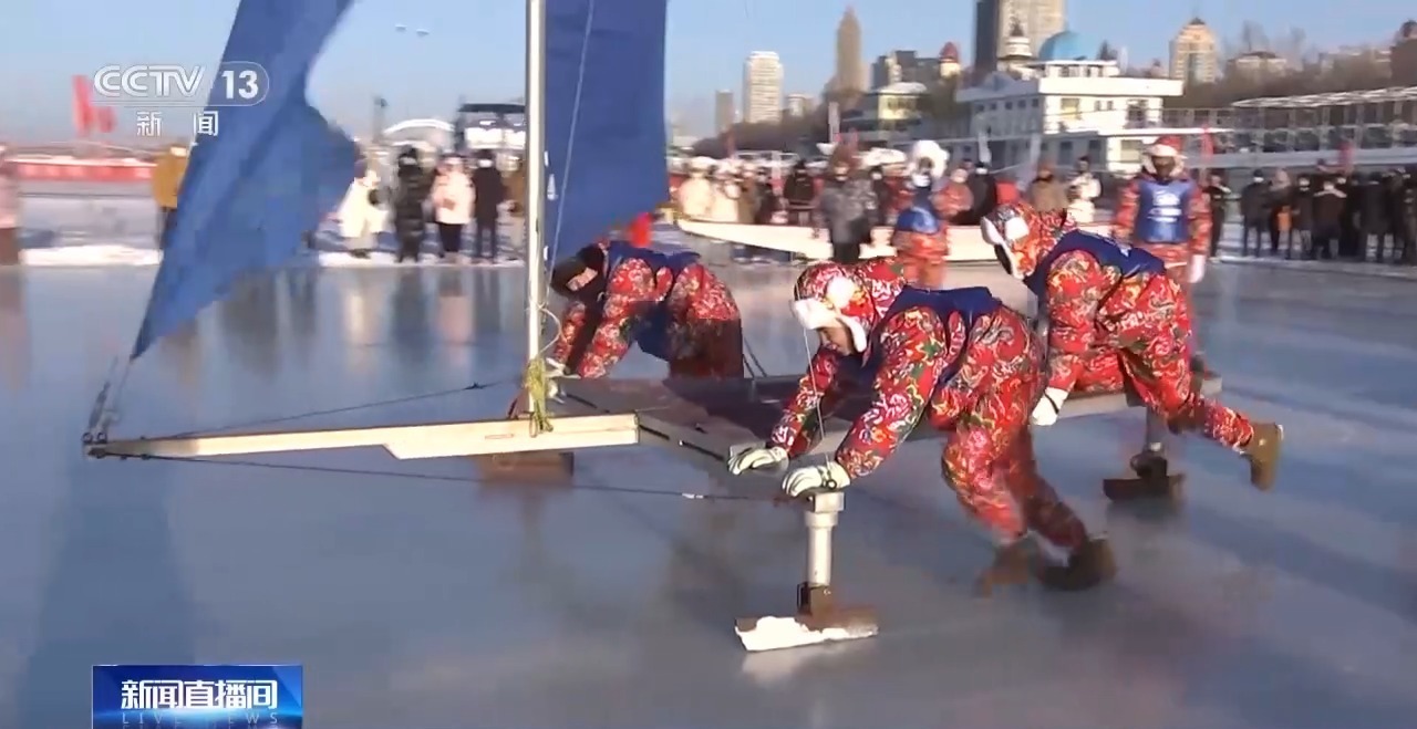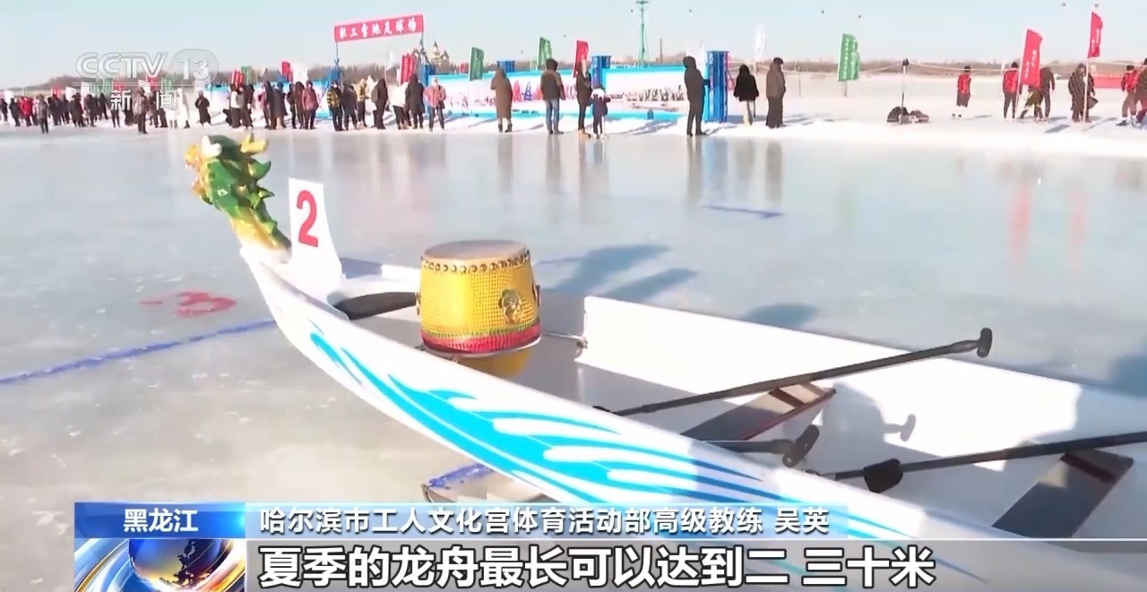哈尔滨市工人文化宫体育活动部高级教练 吴英:冰上龙舟和水上龙舟最大的区别就是长短不一样,局限于冰面的长度,只能采用十二米的龙舟,夏季的龙舟最长可以达到二三十米甚至更长的龙舟。冰上龙舟底下带着冰刀,有冰刀才能在冰上滑行,浆跟普通龙舟的浆都不一样,普通水上的浆是靠划的,有桨叶,冰上龙舟是浆杆和冰锥组成,靠冰锥支地产生动力。