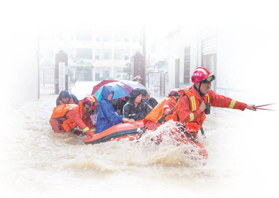 7月7日开始,江西九江都昌县连续两天大雨倾盆,鄱阳湖水位暴涨,多处堤岸告急,洪水漫堤、内涝严重。大港镇的盐田中学471名师生被大水围困。因为学校处在低洼处,四处而来的洪水向学校所在的洼地不停倒灌。九江消防救援队员们接到指令火速赶到,他们推着橡皮艇冲到学校水流最湍急的路口,系好安全绳支点进行布绳,打通救援通道,用橡皮艇一趟趟转移被困师生。