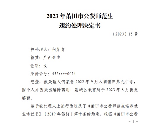 决定书提到,被处理人何某青2022年9月入职莆田第九中学,因个人原因提出解除聘用,荔城区教育局于2023年8月批复解聘。
