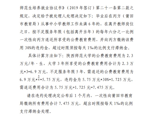 毕业后在莆田市教育局从事中小学教师工作未满6年的,在离开教师岗位之日,按不足服务年限(包括离开当年)的每年六分之一比例,一次性向莆田市教育局退还所享受的公费教育费用,并向莆田市教育局缴纳该费用30%的违约金,超过时限须按每天1‰的比例支付滞纳金。经计算,决定给予被处理人需退还费用合计7.475万元处理决定。