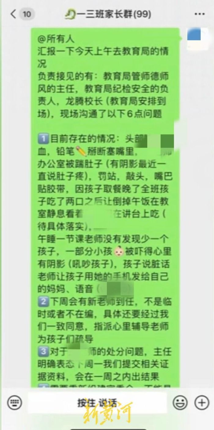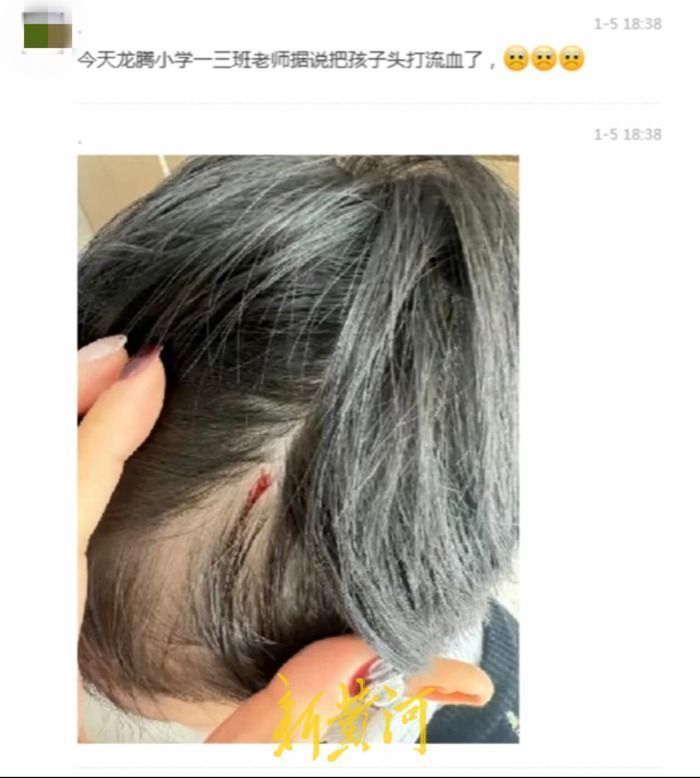 相关网传聊天截图内容显示,1月5日,有网友发布信息称,“今天龙腾小学一(三)班老师据说把孩子头打流血了”,并配发一张孩子头部受伤的照片。此后,在一个名为“一(三)班家长群”的微信群里,有人发布了针对此事的处理进展,并称已与教育局相关领导及涉事学校校长沟通处理此事。与此同时,上述微信群聊天截图还显示,除了“头部被打出血”,还存在“铅笔掰断塞嘴里、在老师办公室被踹肚子、罚站、敲头、嘴巴贴胶带”等诸多情形。
