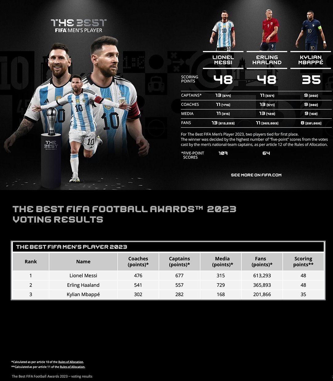 最终,梅西、哈兰德均获得48分,梅西凭借队长第一顺位选票多获奖——107名队长投票第一顺位选择梅西,64名队长投票第一顺位选择哈兰德。
