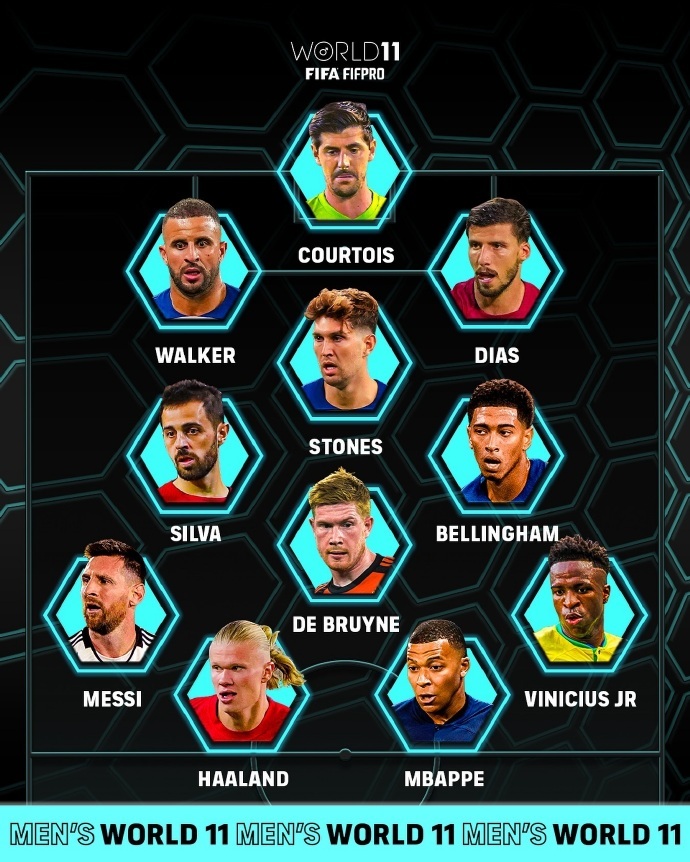 最佳阵容:库尔图瓦、沃克、斯通斯、迪亚斯、B席、德布劳内、贝林厄姆、梅西、哈兰德、姆巴佩、维尼修斯