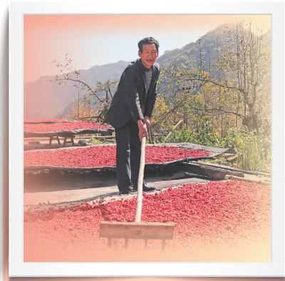 陕西省洋县金水镇牛角坝村村民在晾晒山茱萸。