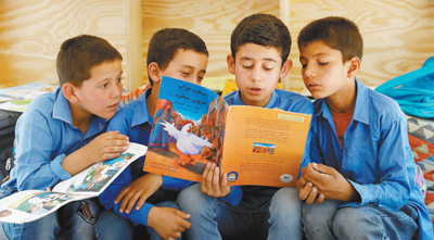 2019年7月2日,孩子们在阿富汗首都喀布尔的一个移动图书馆巴士里看书。