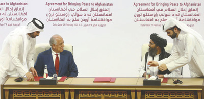 2020年2月29日,在卡塔尔首都多哈,美国阿富汗事务特使扎尔梅·哈利勒扎德(左二)和阿富汗塔利班创始人之一毛拉阿卜杜勒·加尼·巴拉达尔(右二)参加和平协议签署仪式。