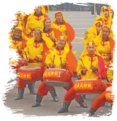我无论如何也想象不出,汾河两岸的先辈们为何能缔造出威风锣鼓,并且用威风锣鼓激活每年这最重要、最隆盛的新春佳节。或许是我居住在黄土高原的缘故,大年,与后来被叫作春节的喜庆日子,来临时却没有一点点春天的气息。冰封河山、寒凝大地,雪花纷飞更是最常见的。莫说百般红紫斗芳菲的蓬勃春色,就是草色遥看近却无的初春景象,也还在祈盼之中。正因为如此,我才一厢情愿地认为春和那个儿时的我一样,正在被窝里贪睡。需得猛击一掌,需得大吼一声,才能惊醒春,春才会迎着寒冽的西北风起步,奔走,直至奋跑,跑进万紫千红,跑进林茂禾盛,跑进五谷丰登。而如这一掌猛击、一声大吼一般,见气势、具活力的,无疑就是先辈们缔造的威风锣鼓。