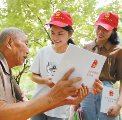 安徽省淮北市,安徽淮北师范大学学生向市民宣传民法典。