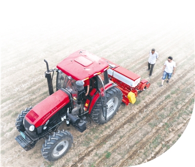 河北省曲周县,中国农业大学科技小院的学生驾驶农机播种玉米。