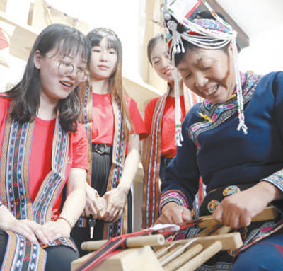 浙江省桐庐县,北京大学“力行计划”研究生专项实践团成员体验莪山畲族彩带艺术。