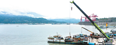 图为湖北省宜昌市秭归县物流园码头,专业拆解公司将退捕渔船吊装上岸,运往专门场所拆解。