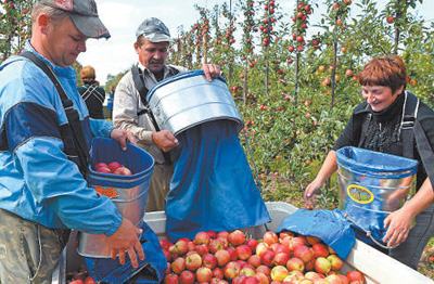 波兰格鲁耶茨县的苹果园中,果农正在装运苹果。