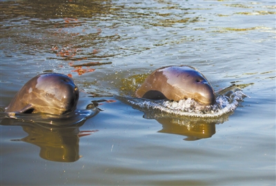 江西鄱阳湖都昌水域,长江江豚在水中畅游。