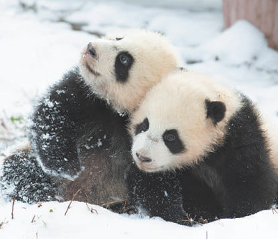 四川卧龙国家级自然保护区迎来降雪,两只大熊猫幼崽在雪中嬉戏。