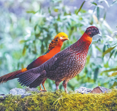 重庆金佛山国家森林公园内,红腹角雉和红腹锦鸡正在漫步觅食。