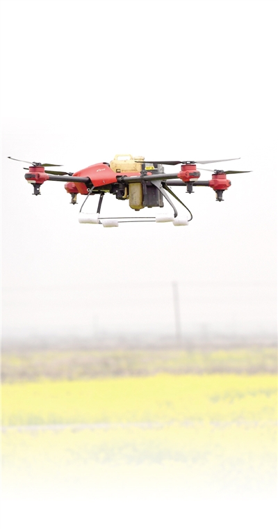 近日,在江西南昌县大田农社智慧农场,无人机在油菜田里喷农药。