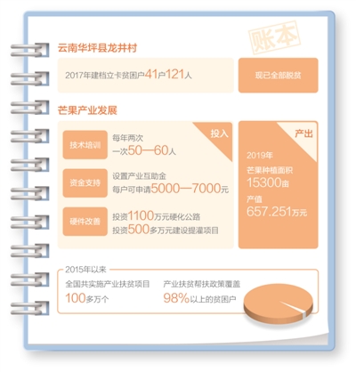 依托金沙江畔丰富的光热水资源,近年来,龙井村大力发展芒果产业。2019年,龙井村全村的芒果种植面积达1.5万亩,人均纯收入1.6万元,正式脱贫出列。截至今年10月,龙井村已经实现了贫困人口全部脱贫。