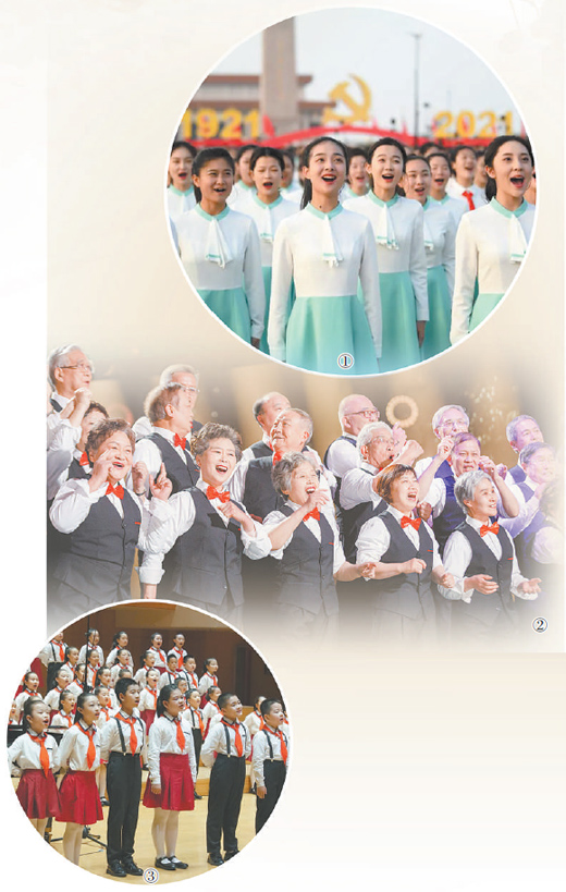 图①:今年7月1日上午,来自北京高校和中学的学生组成的合唱团在天安门广场合唱《唱支山歌给党听》等7首歌曲。