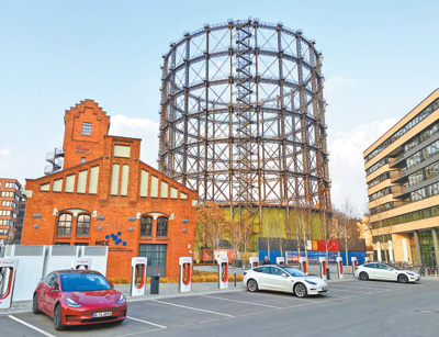 德国欧瑞府能源科技园内,标志性的储气塔、老厂房与新型充电桩共同构成和谐独特的景观。